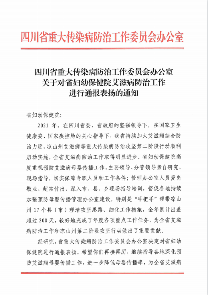 四川省妇幼保健院2021年度艾滋病防治工作连续四年获省重传委表扬