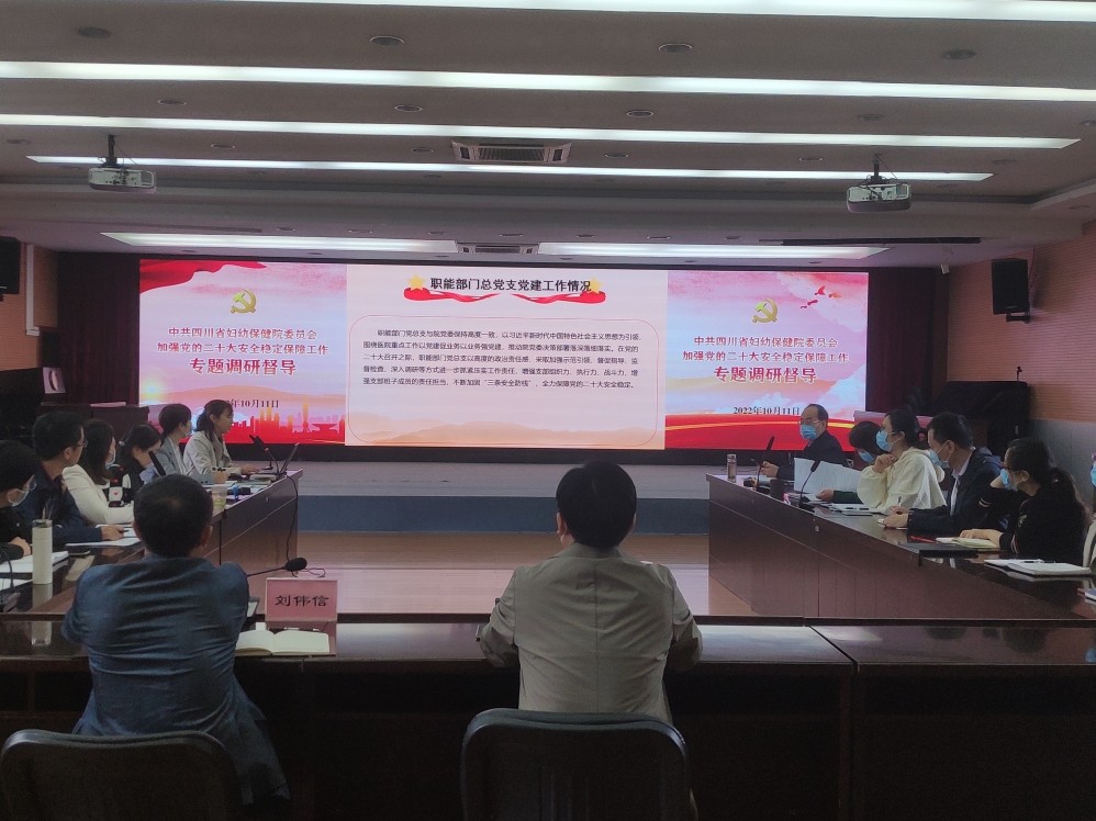 为全面做好党的二十大期间安全稳定工作,2022年10月11日四川省妇幼保健院党委书记张刚一行至职能部门党总支进行专题调研督导,党委委员、副院长刘伟信陪同参加调研。调研督导会议在院综合楼五楼大会议室举行,会议由职能部门党总支书记李渠同志主持,职能部门党总支委员、各党支部书记、职能部门负责人共计24人参加会议。