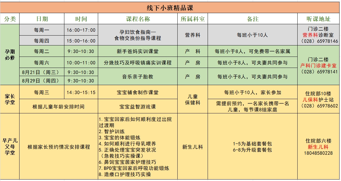 1.线下公益必修课程每周一至周五(国定节假日除外)开课,听课地址:四川省成都市武侯区沙堰西二街290号四川省妇幼保健院晋阳院区5号楼住院部一楼妇幼健康学校。小班精品课可通过预约电话或现场咨询报名听课。