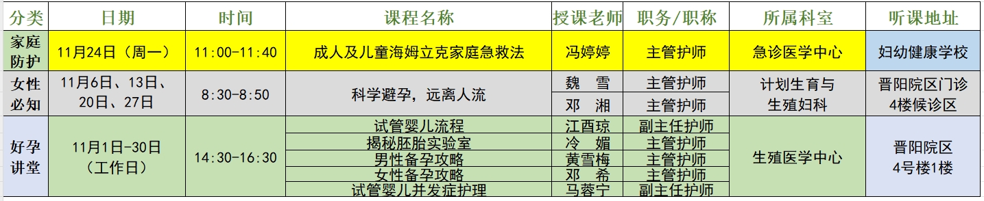 各位宝爸宝妈、准妈妈们,四川省妇幼保健院妇幼健康学校11月课程已备好,超多实用内容,千万别错过!