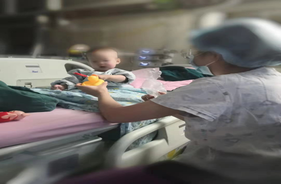 凌晨两点了,万家灯火都已熄灭,这时在PICU,10床小均浩嘴里喊着妈妈,脸上挂着眼泪。11月龄的婴儿正是最依赖妈妈的时候,他与父母分离,与外界隔绝,面对着繁琐的治疗、陌生的环境,他的心里该是多么害怕、无助。就在这时,一个年轻的身影出现在他的床旁,小鸭子、检查手套做的气球、毛绒玩具......护士阿姨带来了好多好多的玩具,虽然他不会表达,但是他肯定能感受到坐在他床旁的阿姨带着温暖的笑容用温柔的语气哄着他,陪伴他,他的心里能感受到在远离妈妈的地方有一个阿姨在凌晨给了他如妈妈一般的爱。