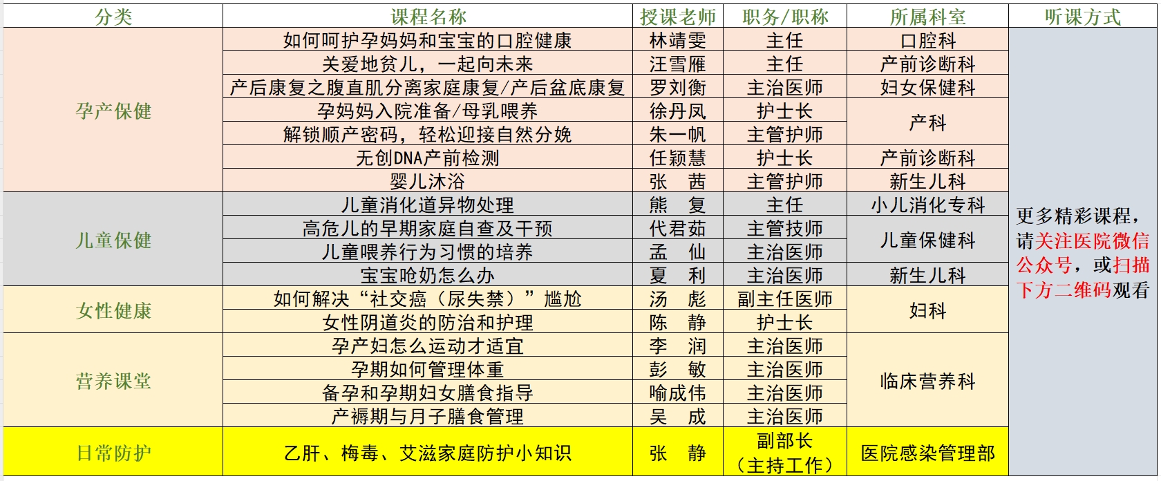 您还可以通过医院微信公众号观看线上公益课,课程内容丰富,随时随地学习妇幼健康知识。