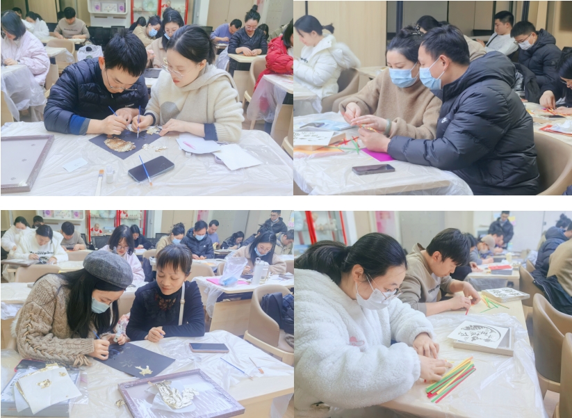 紧接着,手工指导老师细致拆解非遗竹编画与新年金箔画的制作要领。竹编画承载传统韵味,一编一织间寄托“竹报平安”的美好期许;金箔画喜庆灵动,红金相映间尽显“喜乐常伴”的新年寓意。老师手把手示范、耐心答疑,助力每组家庭快速掌握制作技巧。