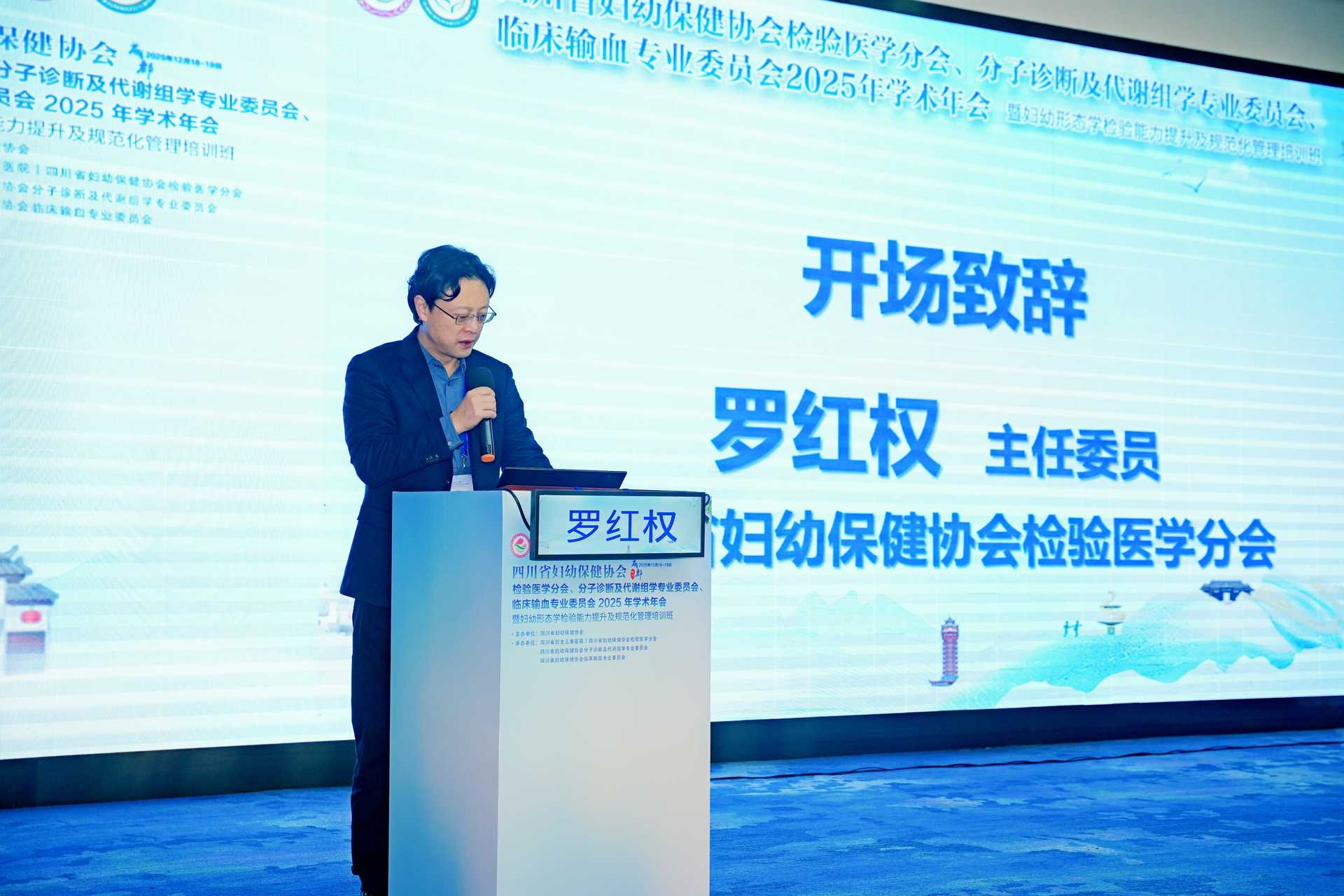 开幕式上,四川省妇幼保健协会检验医学分会罗红权主任委员致辞。他回顾了分会 2025 年的工作亮点并表示,检验医学是守护妇幼健康的 “前哨”,精准的检验报告是临床决策的关键依据,希望全体同仁以此次会议为契机,实现 “学有所思、学有所获、学有所用”。四川省妇幼保健协会安彩霞副会长则强调妇幼健康是 “国之大者”,检验医学是守护这份 “大” 的重要力量,坚信通过本次会议能凝聚更多智慧、达成更多共识、形成更强合力,推动我省妇幼检验医学事业再上新台阶。