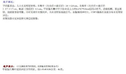 大小:首先会描述甲状腺整体大小,正常甲状腺左右叶大小约(45-60mm)*(15-25mm)*(15-20mm),峡部厚度约2-6mm。若提示甲状腺肿大或缩小,可能与甲亢、甲减、桥本氏甲状腺炎等疾病相关。
