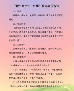 广汉市出生管理办公室为减少群众在办理《新生儿出生医学证明》和“新生儿出生一件事”事项中因未带齐办理证件来回奔波路程,要求辖区各签发机构将以往新生儿出生后的宣传告知工作前移,通过医院微信公众号向新建卡孕妇转发出生医学证明相关宣教,让群众提前知晓办理流程,缩短群众办证等待时间,提高群众满意度。