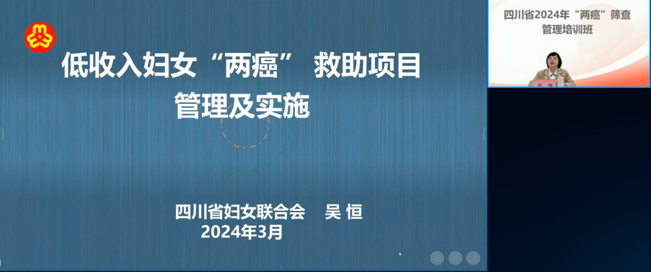 四川省妇女联合会发展部吴恒主任科员系统介绍国家及我省低收入“两癌”患病妇女救助政策,详细说明救助范围、申报流程和救助流程,并分享乐山市、遂宁市、凉山州等地“两癌”筛查救助工作的新措施、好做法。