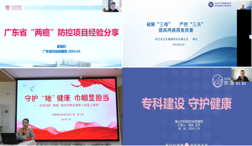 广东省妇幼保健院夏建红主任分享广东省通过“品管圈+PDCA”分析评价将辖区管理与机构内管理有机结合。内江市卫生健康委陈红副主任分享通过破解项目管理、组织管理和闭环服务三大难题提升“两癌”筛查质量。阿坝州金川县妇联刘兴蓉主席分享当地妇联以健康宣教和组织动员为抓手协助做好“两癌”筛查工作。眉山市东坡区妇幼保健院王平院长分享东坡区以专科建设助推筛查质量提升及机构发展的东坡方案。